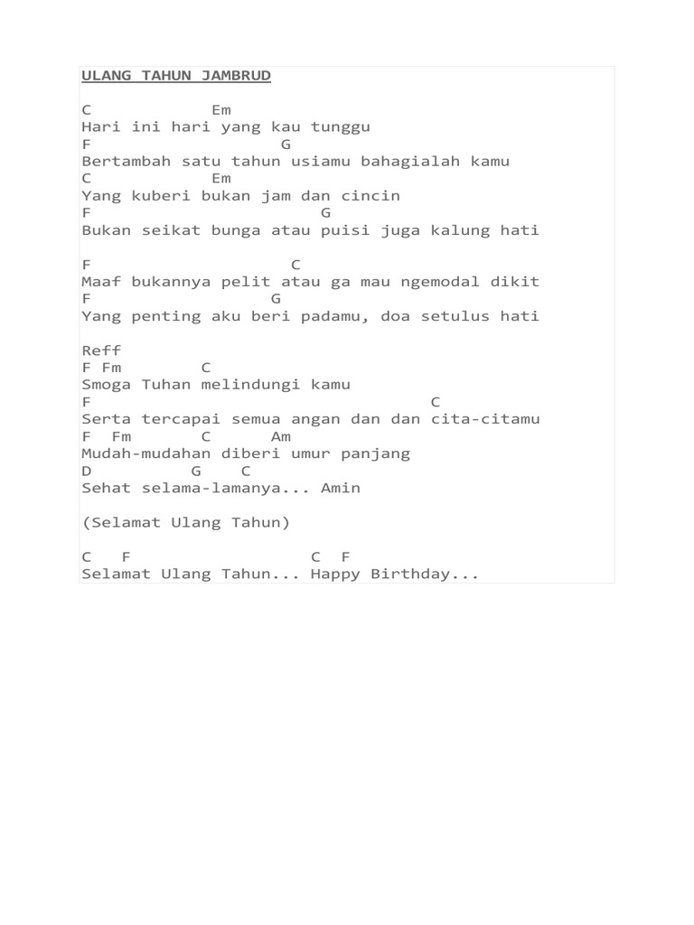 Agustus september kita mencoba tuk saling setia d fm g a januari aku berkenalan denganmu d fm g a februari aku mendapatkan cintamu d fm g a maret april mei juni kita smakin menyatu d fm g a juli agustus. Februari aku mendapatkan cintamu. Chorus d fm g a januari aku berkenalan denganmu d fm g a februari aku mendapatkan cintamu d fm g a maret april mei juni kita smakin menyatu d fm g a juli agustus september kita mencoba tuk saling setia d fm g a januari aku berkenalan denganmu d fm g a februari aku mendapatkan cintamu d fm g a maret april mei juni kita smakin.