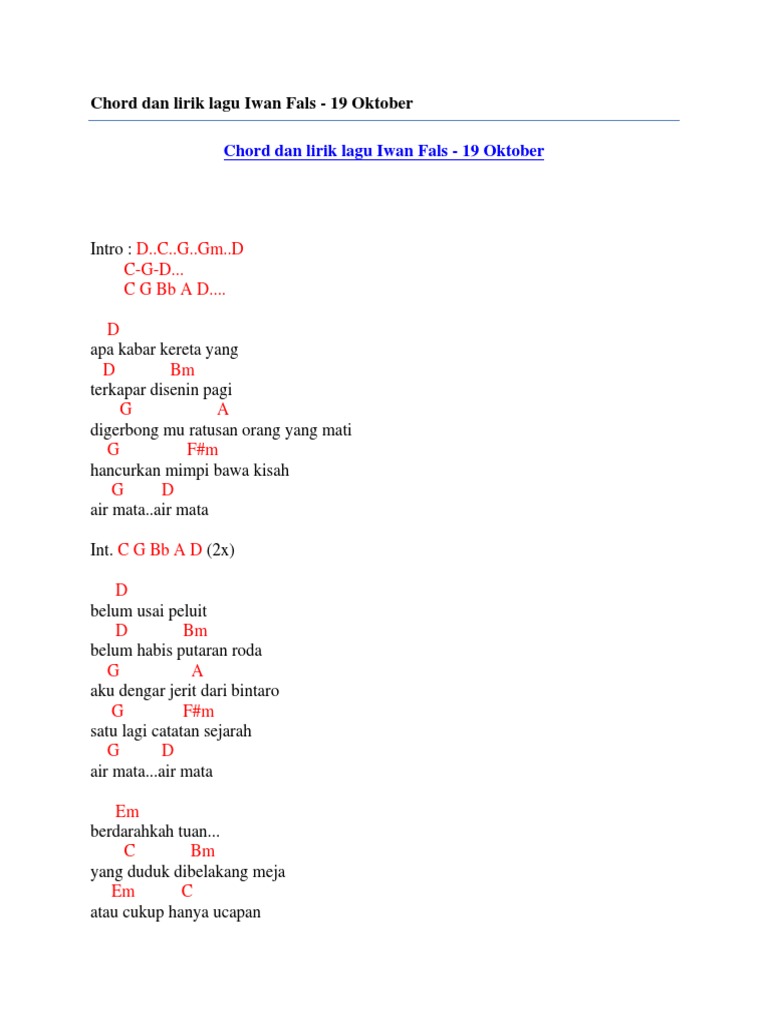 Chord Dan Lirik Lagu Iwan Fals 19 Oktober